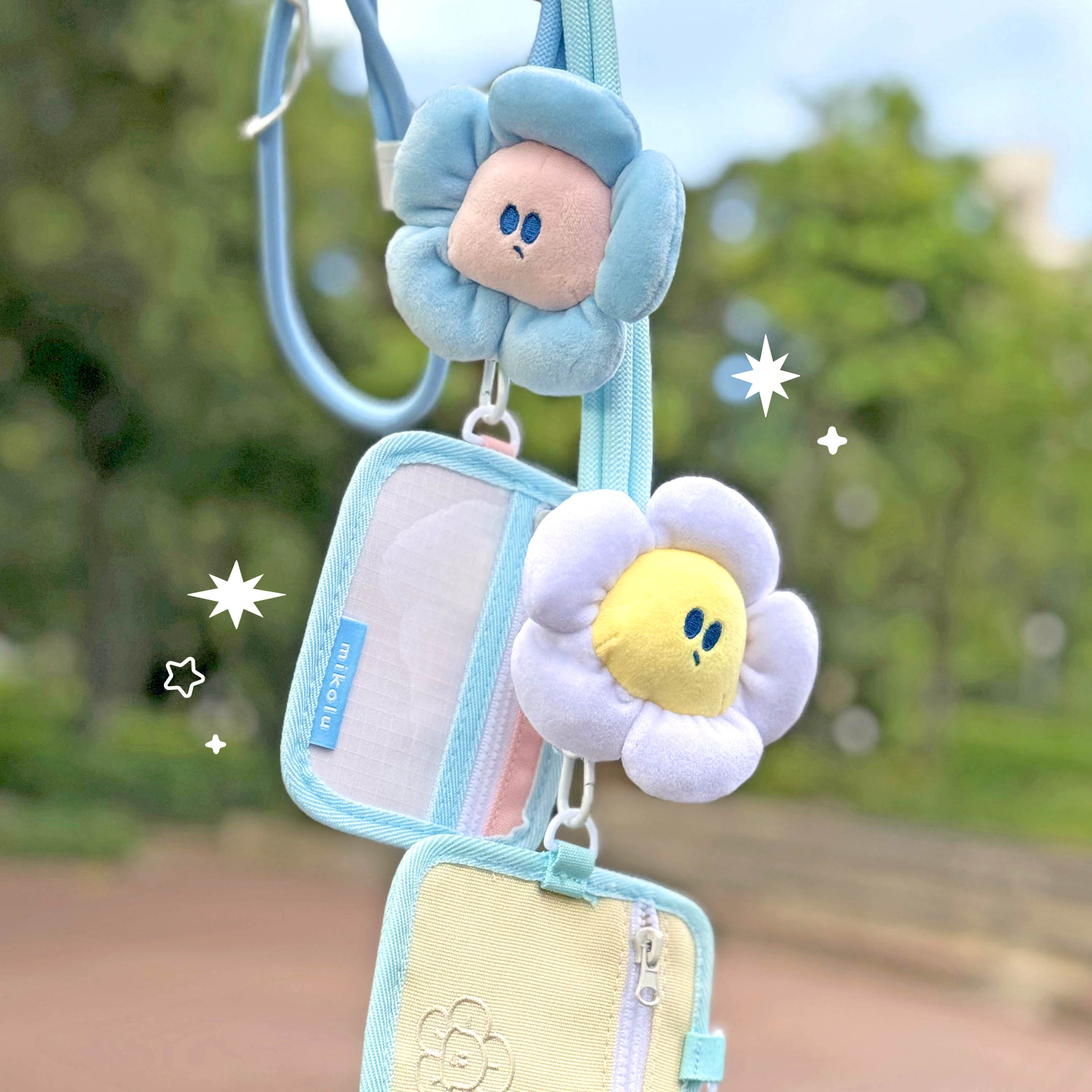 ● 調節式背繩*1、可拆卸小花、雙面拉鍊證件套
